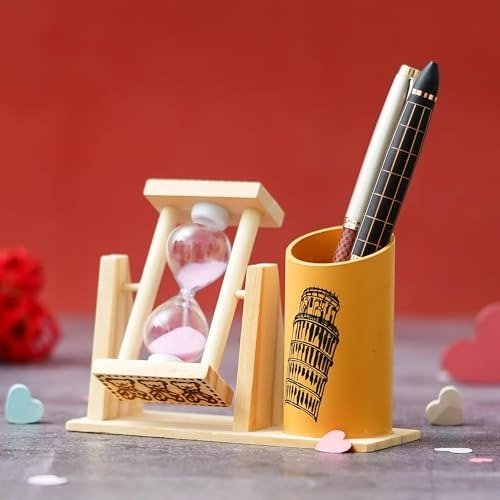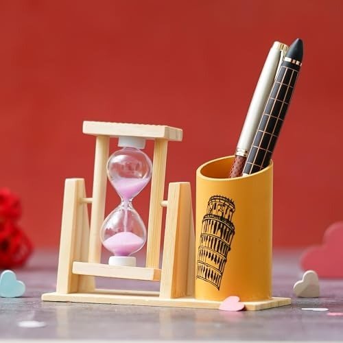 Webelkart Premium Wooden Hour Glass Timer Pen/Pencil Stand for Office/Home Decor |Office Desk Storage with Drawer File Organizer | Desktop Organizer (5″ Inches) – Fast Shipping to USA & Canada