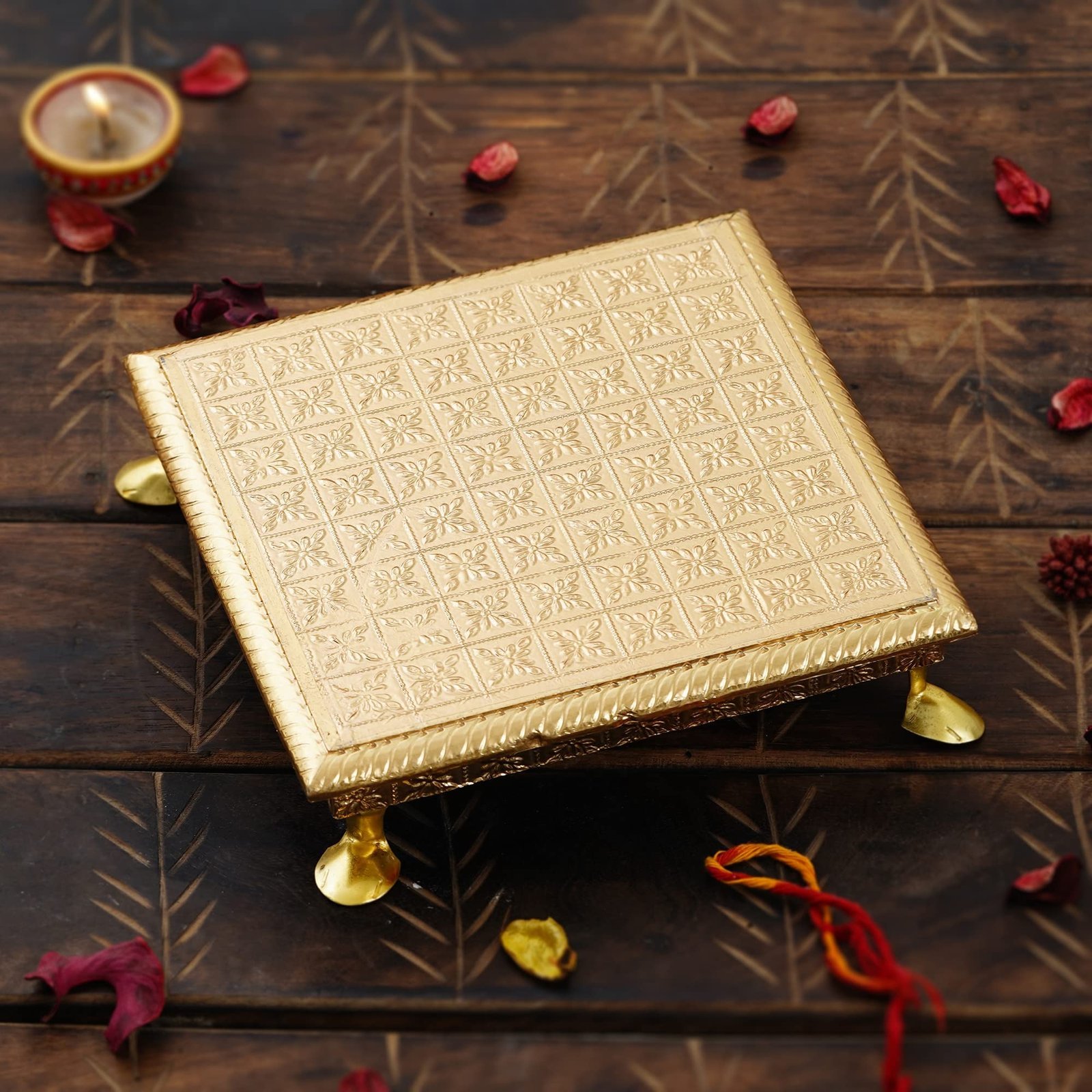 Webelkart Wooden Brass Fitted Golden Rajwadi Chowki/Patla -4.50″x 4.50″x 2.00″ Inch – Fast Shipping to USA & Canada