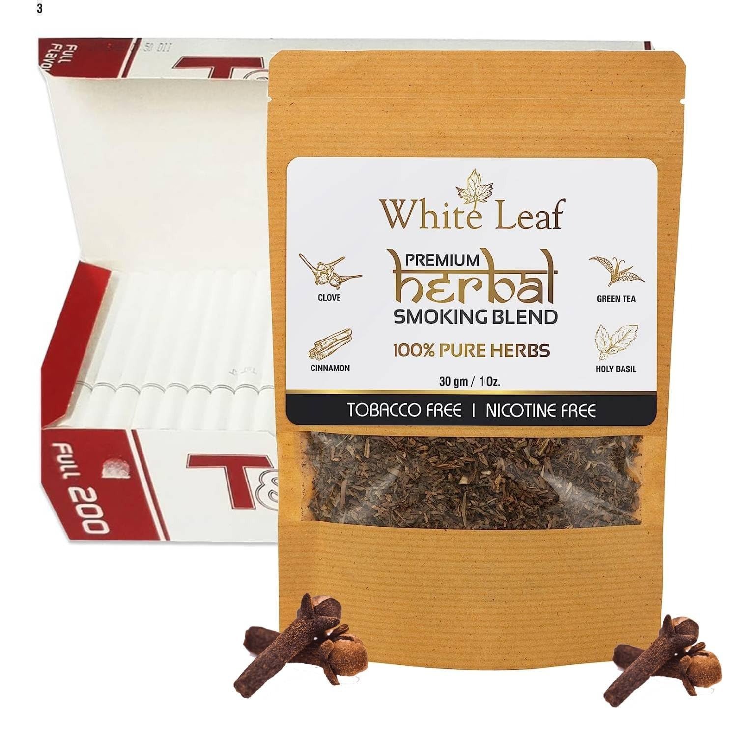 White Leaf Premium Herbal Mixture Smoking Blend 100% Tobacco & Nicotine Free 30 gram – Organic Ayurvedic Herbs Mixed(Herbal Smokes – No nicotine/No Tobacco) With Empty Cigarette Tubes Box Of 200 Pcs – Fast Shipping to USA & Canada