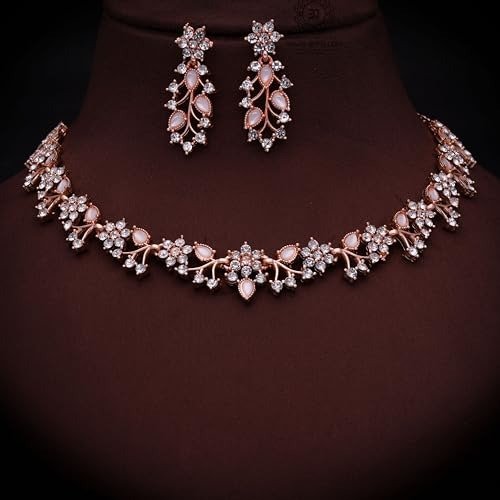 - What You Receive: – This exquisite jewelry ensemble includes a necklace and a matching pair of earrings. The rose gold-plated necklace features intricate detailing with artificial stones and is fastened with an S-hook closure. Accompanying it are elegant drop earrings, each secured with a post and back closure.