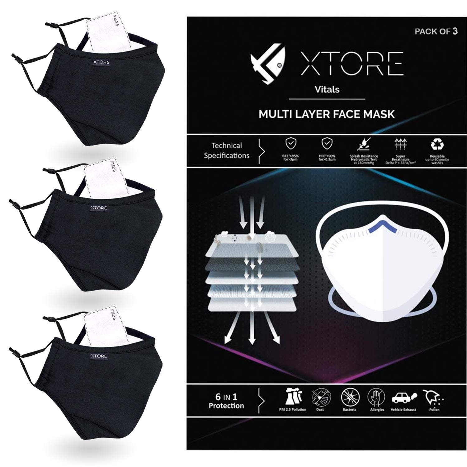 Xtore N95 FDA CE Certified Anti pollution Cotton Reusable Washable without valve Unisex Cloth Mask (Black, Pack of 3) – Fast Shipping to USA & Canada