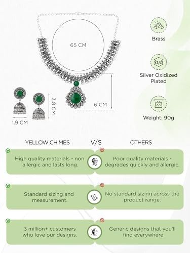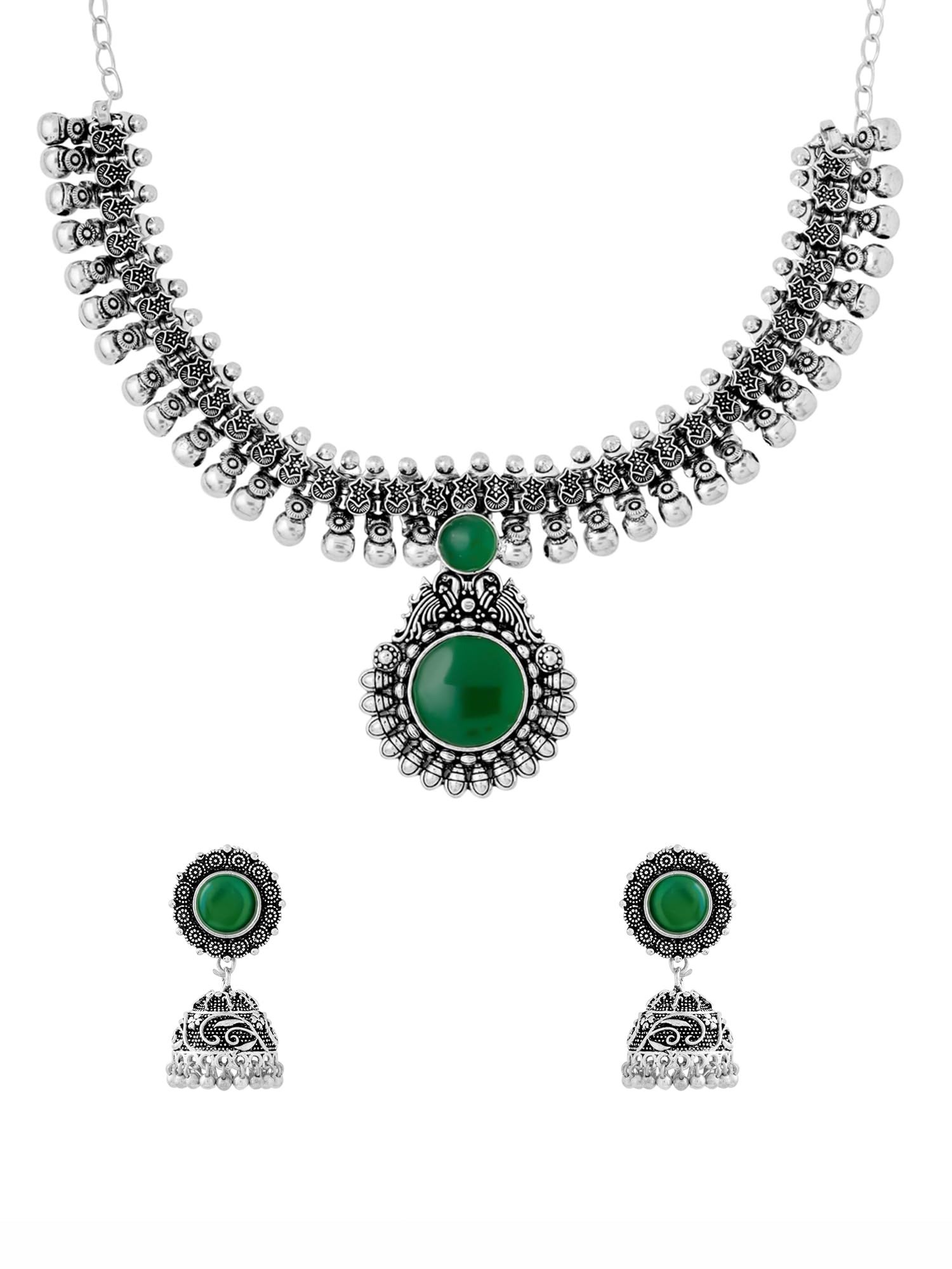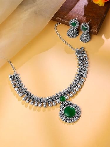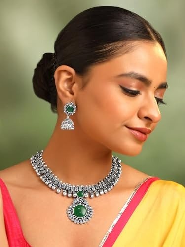 - Timeless silver oxidized necklace set designed for women?this chic and modern antique vintage Kolhapuri necklace features exquisite green stones and comes with matching Jhumka earrings. It?s a breathtaking accessory that complements all your special occasions, events, and festivals. Our product makes an ideal gift for Valentine’s Day, anniversaries, or birthdays for women, girlfriends, or wives.