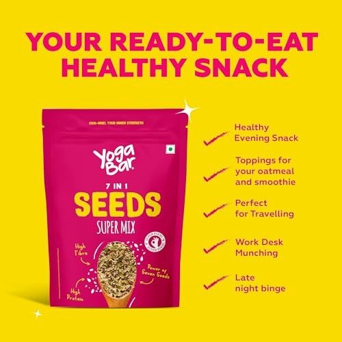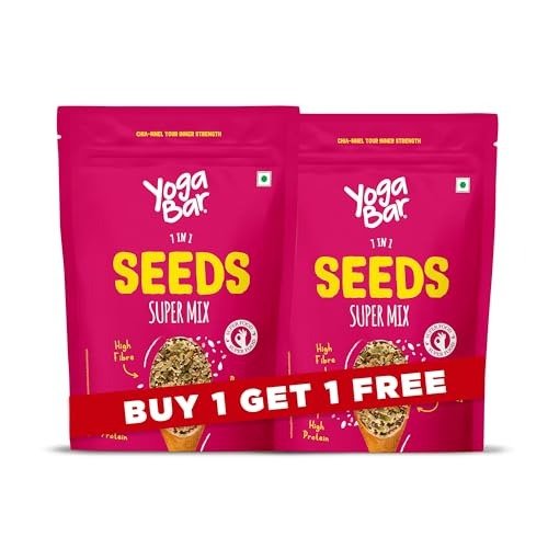 Elevate your daily nutrition with Yogabar’s 7-in-1 Seeds Super Mix, a thoughtfully curated blend that packs the goodness of seven premium seeds in every serving. This versatile super mix is rich in both fibre and protein, making it an excellent addition to your healthy lifestyle. Perfect for sprinkling over salads, mixing into smoothies, or adding to your morning breakfast bowl, these seeds deliver a delightful crunch along with essential nutrients. The convenient resealable packaging ensures your seeds stay fresh and ready to use. Currently available in an attractive buy-one-get-one-free offer, this super mix is ideal for health-conscious individuals looking to incorporate nutrient-dense ingredients into their daily diet. The mix comes with a vegetarian certification mark, ensuring quality and purity. Add this power-packed seed mix to your pantry and transform ordinary meals into nutritious delights.