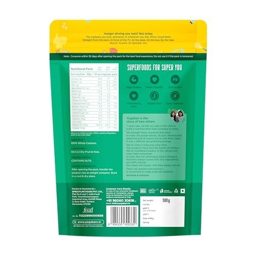 Yogabar Cashews 500g | 100% Natural & Premium Whole Organic Cashew Nuts | Extra Crunchy King Size Kaju Nuts | Superior Nuts & Dried Fruits | Abundant in Fiber, Vitamins E, K, B6 & Enhances Immunity | Wholesome Snack Option