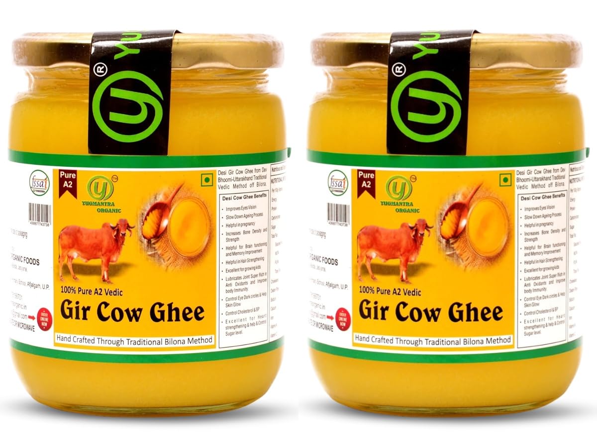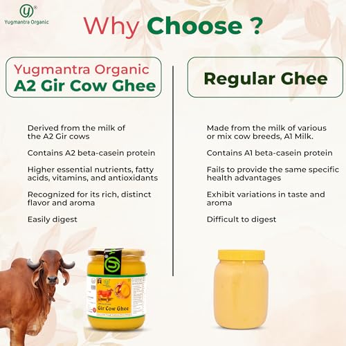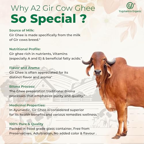 - >Authentic Desi Gir Cow Ghee: Yugmantra Organic Desi Gir Cow Ghee is crafted from A2 milk sourced from the indigenous Gir cow of India, utilizing the age-old Bilona method. This ghee is a powerhouse of vitamins that supports overall health. It serves as a vital superfood for developing children and is exceptionally rich in antioxidants, enhancing immunity. Rest assured, it is 100% natural and pure, guaranteed to be free from pesticides and chemicals.
