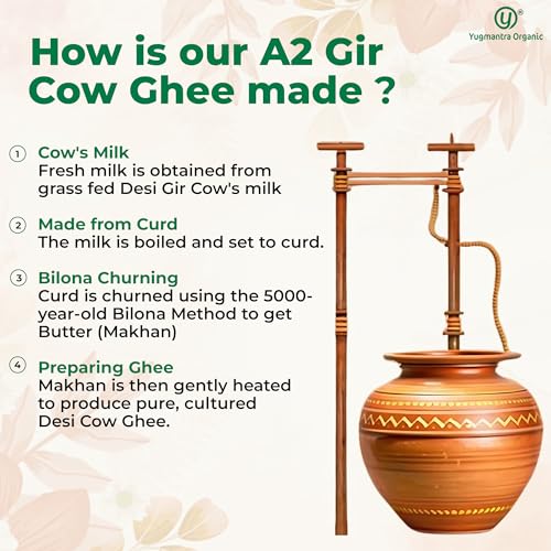 - >BILONA CURD CHURNING TECHNIQUE: Yugmmantra Organic A2 Cow Gir Ghee is meticulously produced from A2 Milk sourced from Gir cows, utilizing the age-old Bilona method. This ghee is entirely natural and pure, assured to be free from pesticides and chemicals. The traditional Bilona process for creating Desi Ghee involves the following steps: Milk is transformed into curd in clay pots, butter is extracted, and then the butter is gently heated over low flame until it becomes granulated.