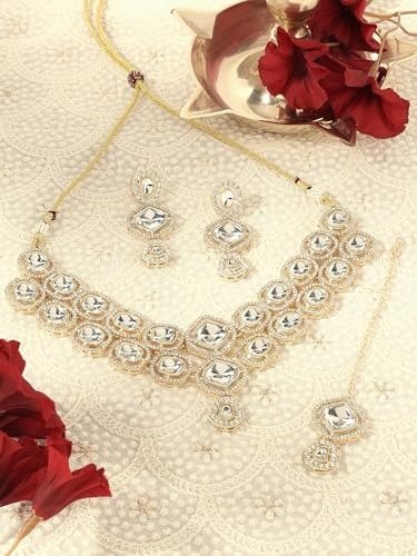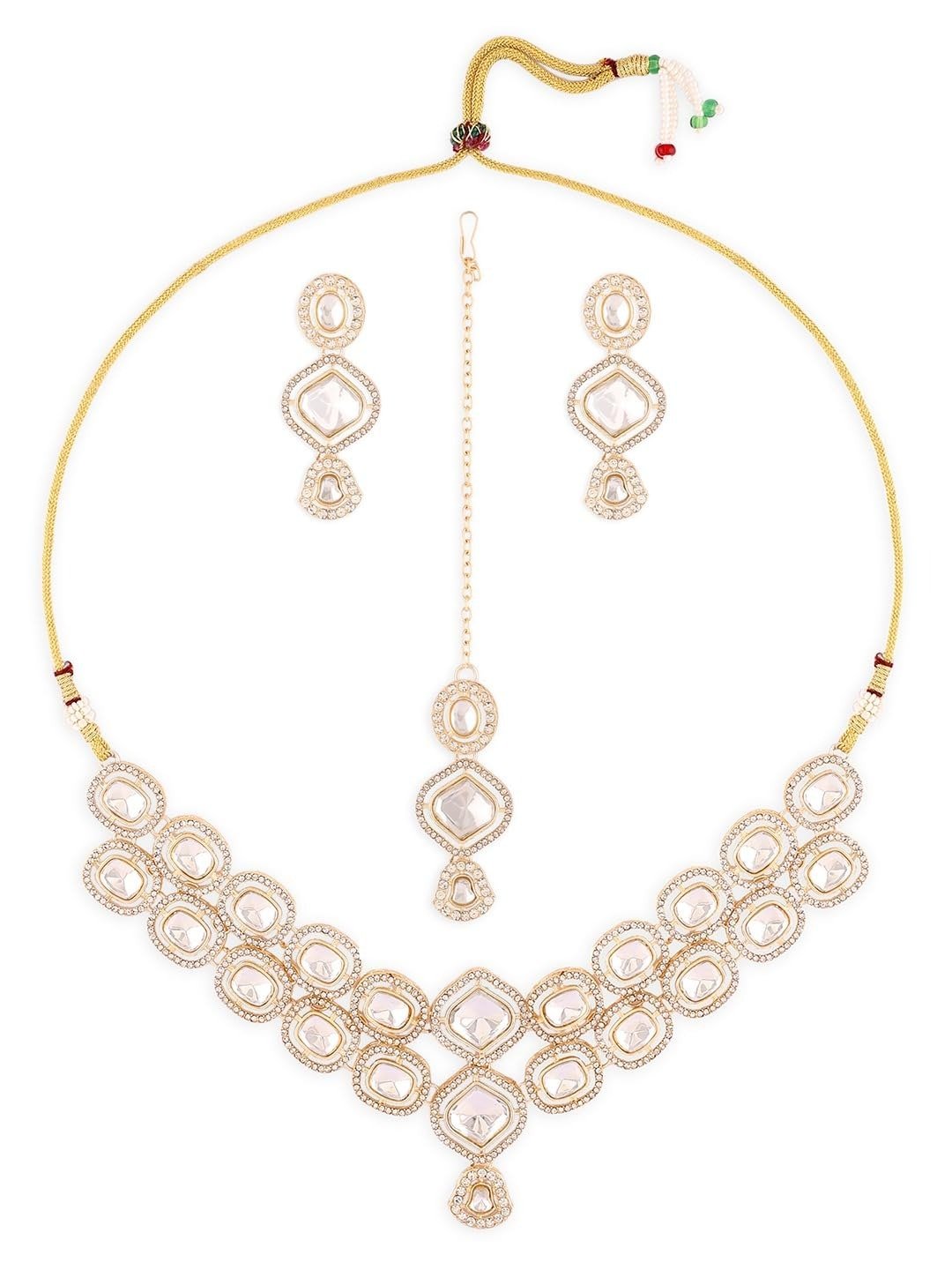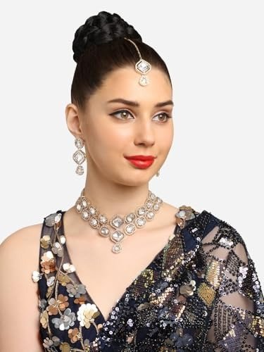 ZAVERI PEARLS Gold Tone Austrian Diamonds Artificial Stones Bridal Necklace Earring & Maangtikka Set For Women-ZPFK18555 – Fast Shipping to USA & Canada