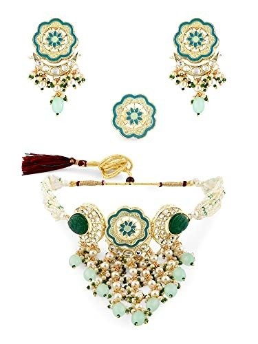 ZAVERI PEARLS Turquoise Blue & Green Meenakari Cascading Waterfall Beads Necklace Earring & Ring Set For Women-ZPFK14607 – Fast Shipping to USA & Canada