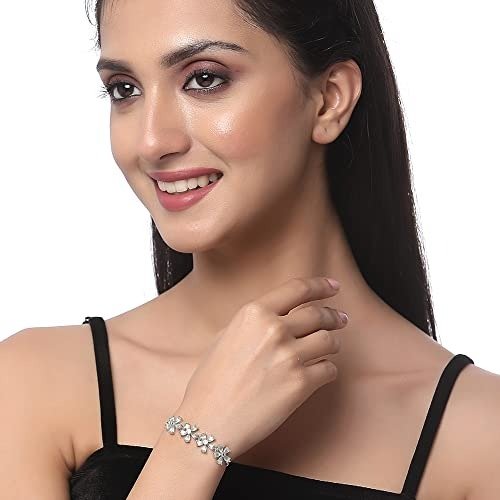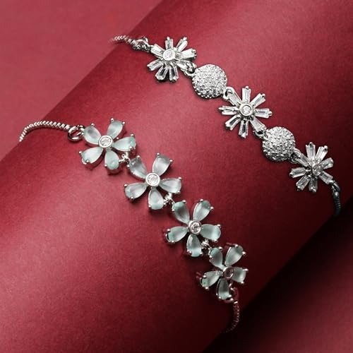 - What You Receive: Two silver-plated brass adjustable bracelets adorned with American diamond crystals, finished with rhodium plating. These designer bracelets are designed to accommodate various wrist sizes, ensuring a comfortable fit for both women and girls.