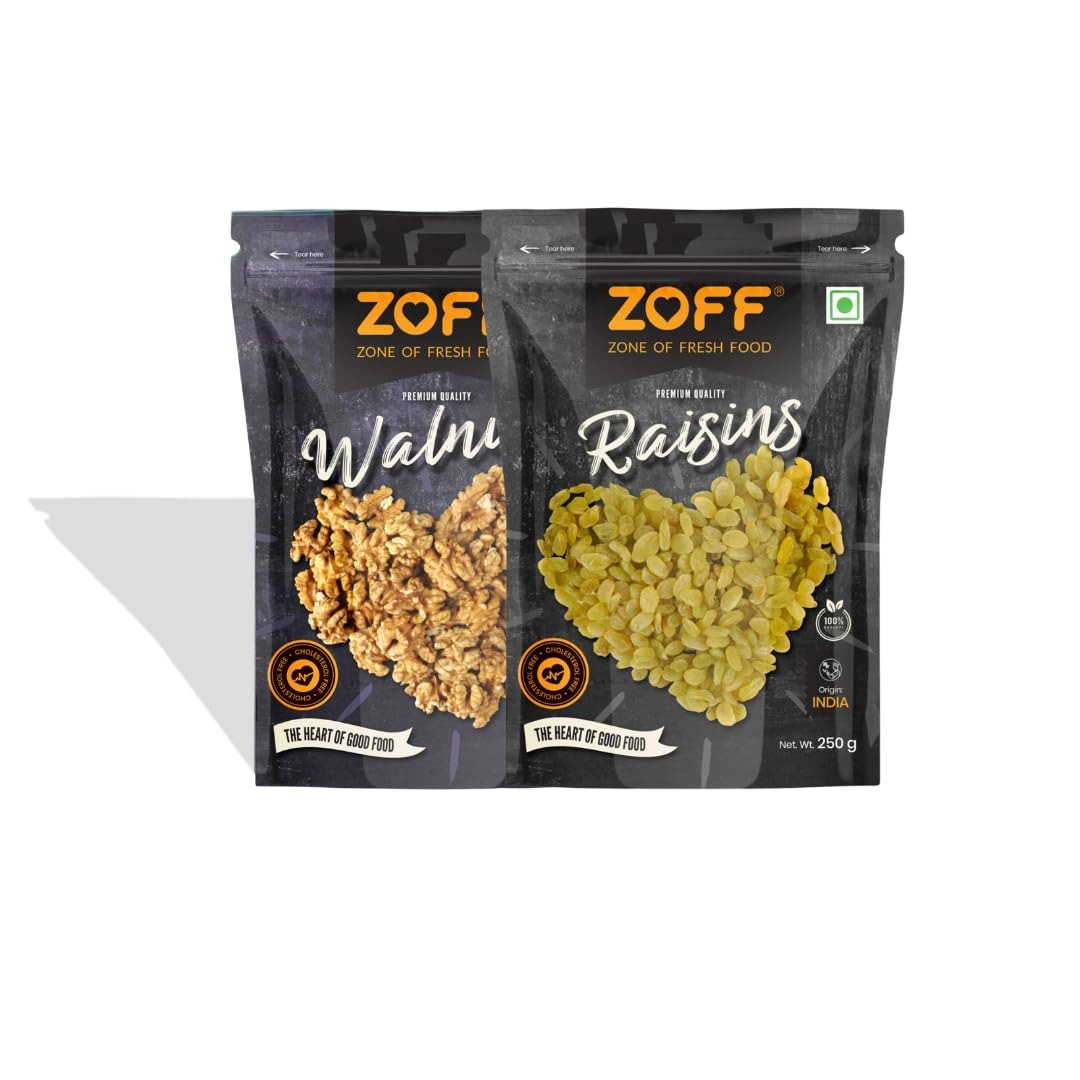 - Zoff makes it easy to enjoy the health benefits of dry fruits every day. With this combo pack, you get both raisins and walnuts together?so you can conveniently add their nutrition to your daily routine.